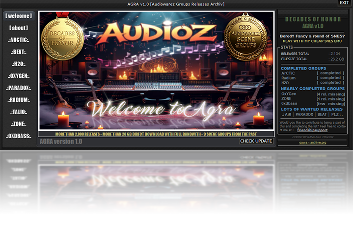 AudiowareZ-SpeciaL AGRA v1.0 Decades of honorAUDIOWAREZ GROUPS RELEASES ARCHIVE .:0xdbass:. .:ArCTiC:. .:BEAT:. .:H2O:..:OxYGeN:. .:PARADOX:. .:Radium:. .:ZONE:. .:TALiO:.MORE THAN 2.000 RELEASES – MORE THAN 20 GB DIRECT DOWNLOAD 9 SCENE GROUPS FROM THE PAST INFO DOWNLOAD AGRA v1.0